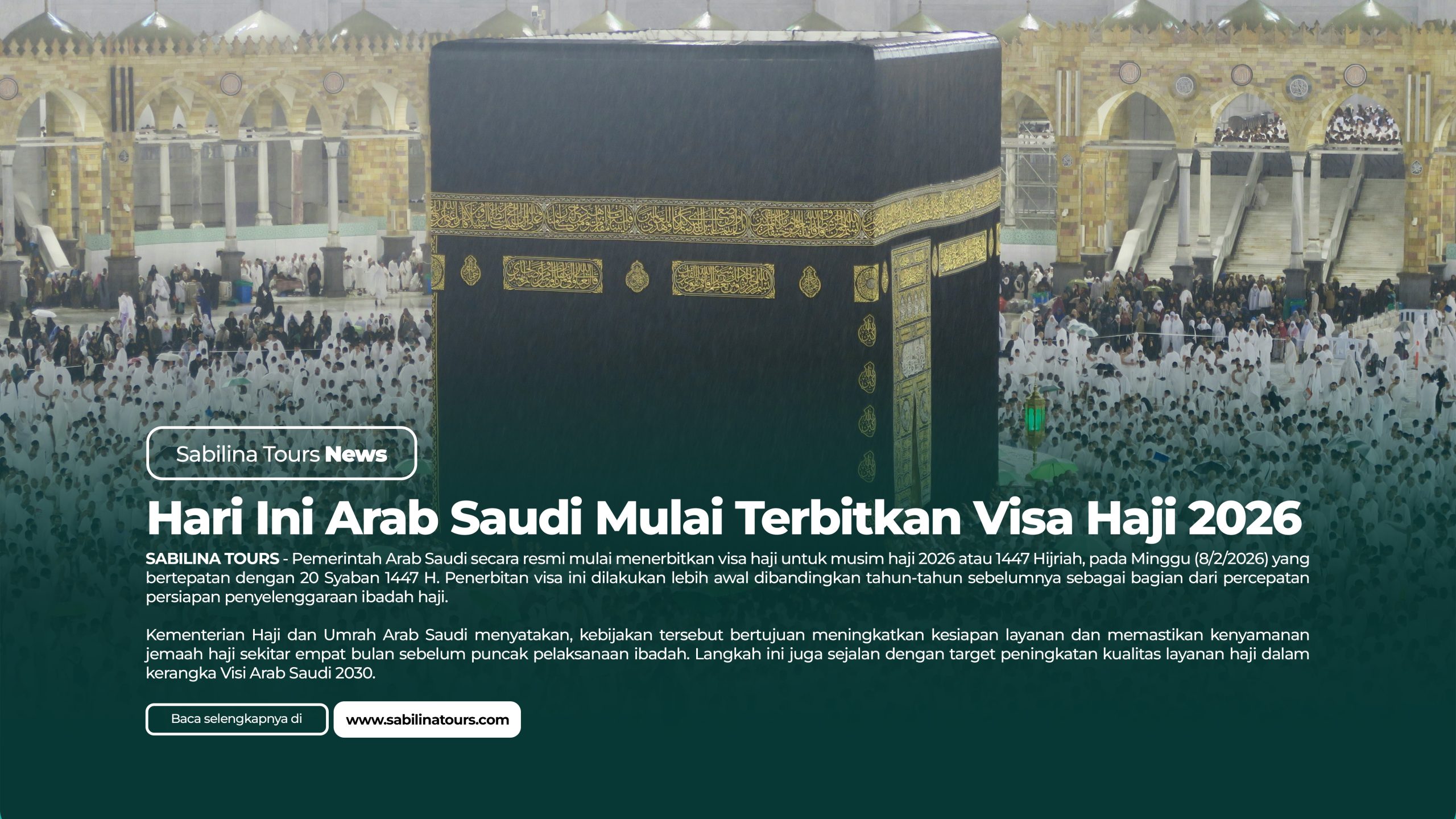 SABILINA TOURS – Pemerintah Arab Saudi secara resmi mulai menerbitkan visa haji untuk musim haji 2026 atau 1447 Hijriah, pada Minggu (8/2/2026) yang bertepatan dengan 20 Syaban 1447 H.