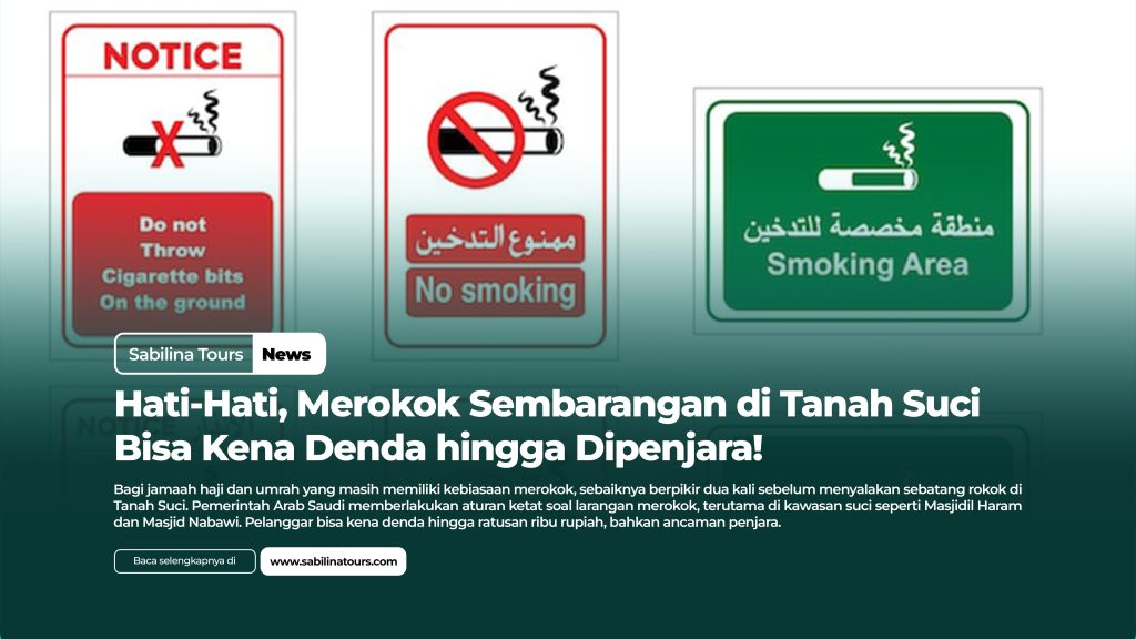 SABILAN TOURS – Bagi jamaah haji dan umrah yang masih memiliki kebiasaan merokok, sebaiknya berpikir dua kali sebelum menyalakan sebatang rokok di Tanah Suci. Pemerintah Arab Saudi memberlakukan aturan ketat soal larangan merokok, terutama di kawasan suci seperti Masjidil Haram dan Masjid Nabawi. Pelanggar bisa kena denda hingga ratusan ribu rupiah, bahkan ancaman penjara.
