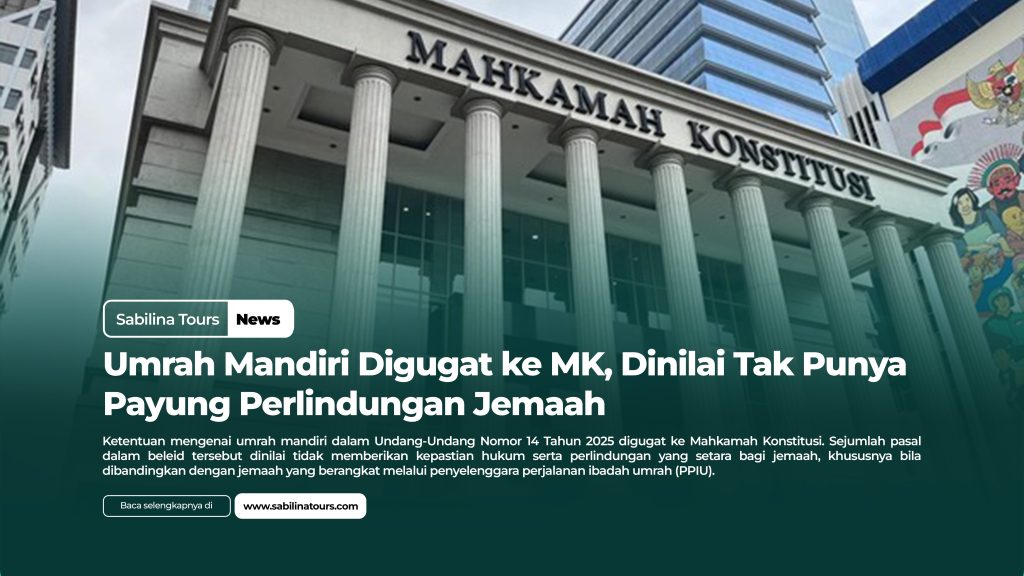 SABILINA TOURS – Ketentuan mengenai umrah mandiri dalam Undang-Undang Nomor 14 Tahun 2025 digugat ke Mahkamah Konstitusi. Sejumlah pasal dalam beleid tersebut dinilai tidak memberikan kepastian hukum serta perlindungan yang setara bagi jemaah, khususnya bila dibandingkan dengan jemaah yang berangkat melalui penyelenggara perjalanan ibadah umrah (PPIU).